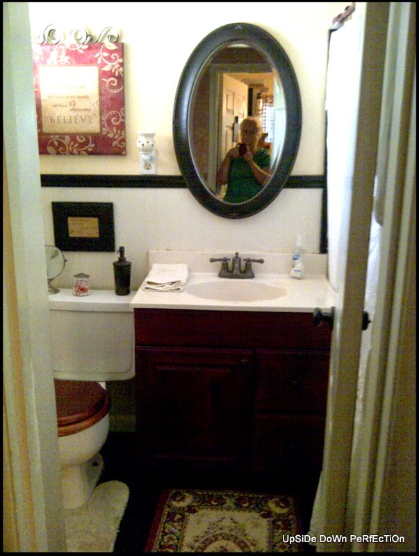 I have always loved shutters. A friend of ours had given us some shutters out of his old house when he was renovating it. They have been up in the loft out in our "barn" for YEARS. I was trying to decide what kind of window treatment I wanted to use in the "new" bathroom, when I remembered those shutters. Our bathroom window is 24" x 36". The shutters were 48" x 32". Not quite the right size but my sweet Bill figured out how to make them work.